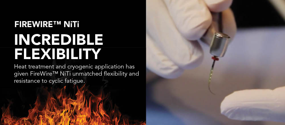 Several manufacturers have heat treated NiTi files which increase flexibility and resistance to cyclic fatigue. However, EdgeEndo® proprietary heat treatment process called FireWire™ has created NiTi unmatched flexibility and resistance to cyclic fatigue. FireWire™ NiTi files provide cyclic fatigue resistance many more times greater than other NiTi files.