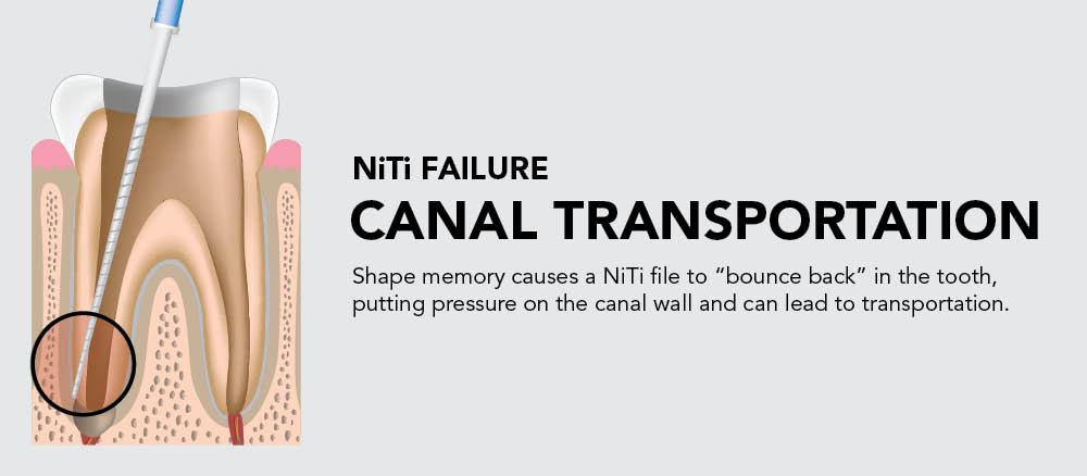 NiTi files exhibit “shape memory” which can initially seem beneficial, as it files do not “wobble” when placed in hand piece. However, shape memory causes a NiTi file to “bounce back” in the tooth, putting pressure on the canal wall and can lead to transportation of the canal, and unnecessary removal of dentin.