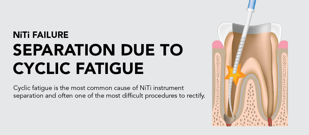 Cyclic fatigue of a NiTi file occurs when the metal blade is subjected to repeated cycles of tension and compression that lead to stress and hardening of the material. Eventually this leads to fracture of the metal. Cyclic fatigue is the most common cause of NiTi instrument separation and often one of the most difficult procedures to rectify. Judging when a NiTi file is poised to separate has proven to be very difficult.