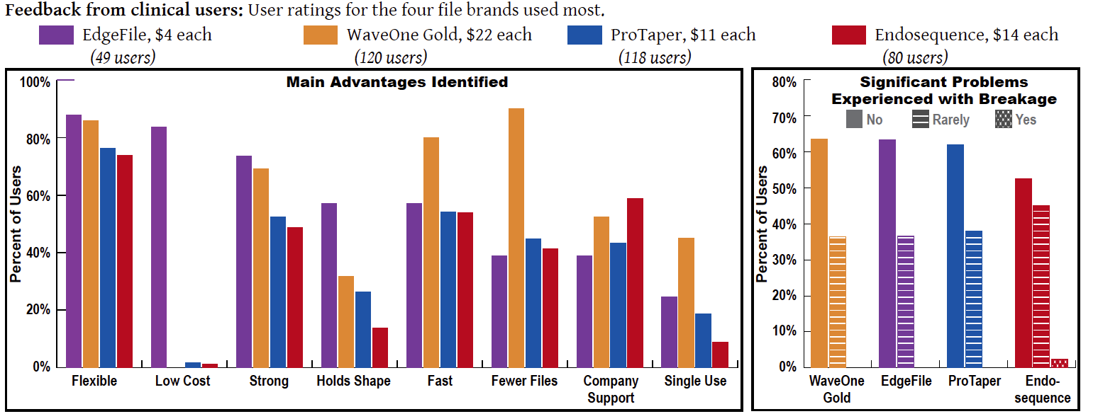 User ratings for EdgeFile, WaveOne Gold, ProTaper, and Endosequence
