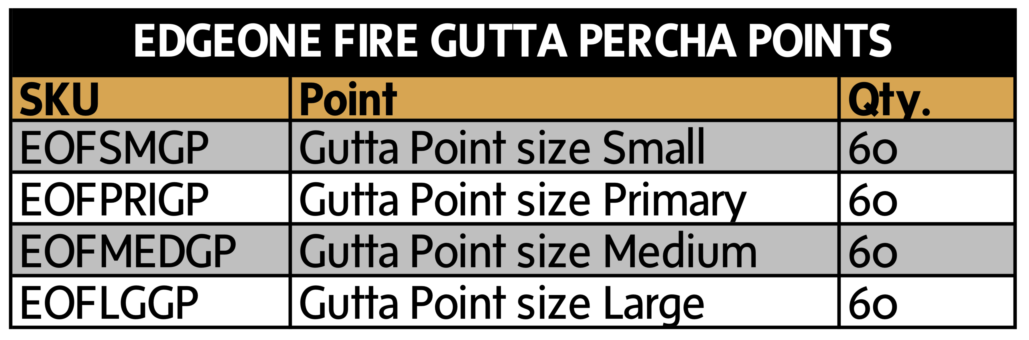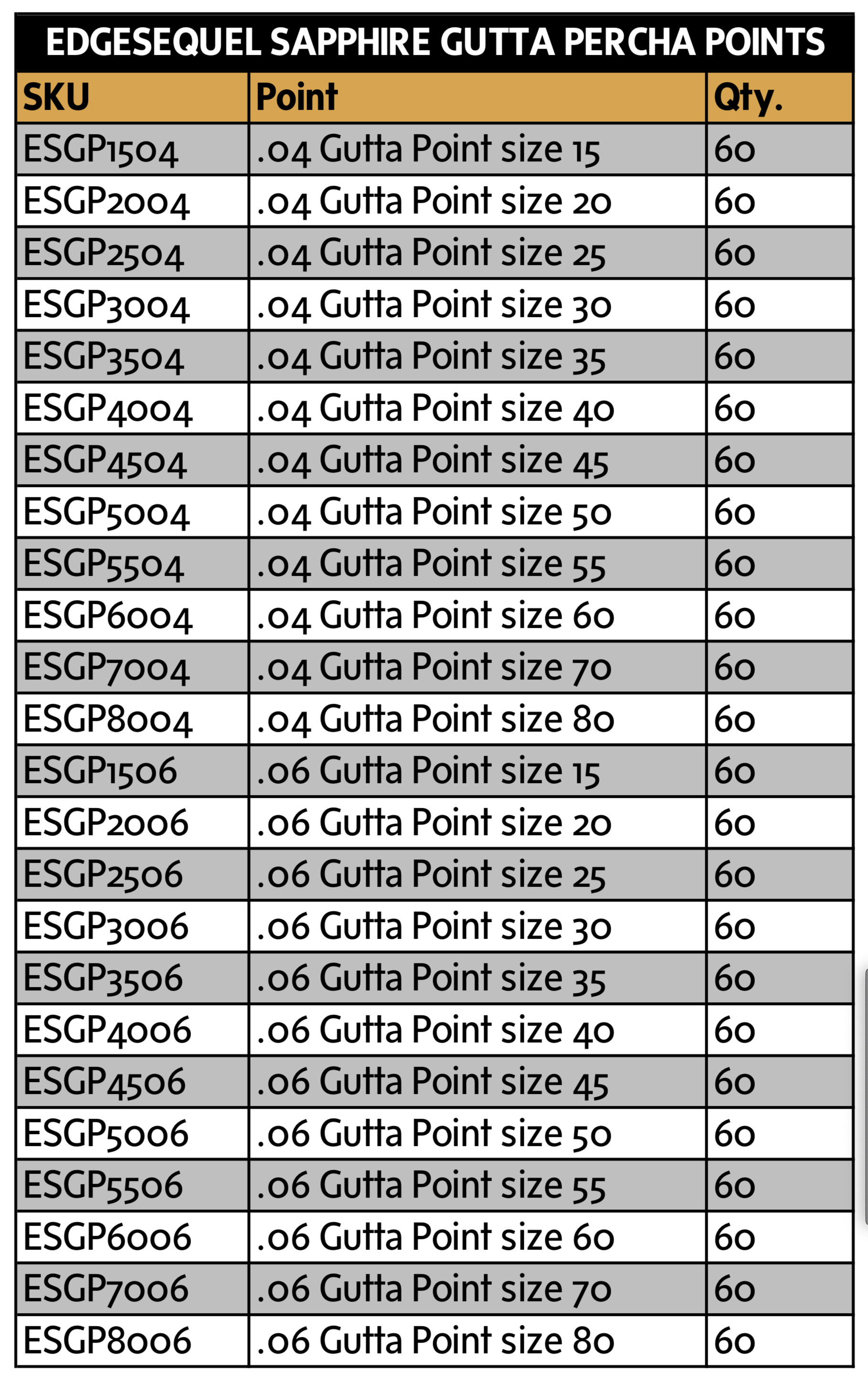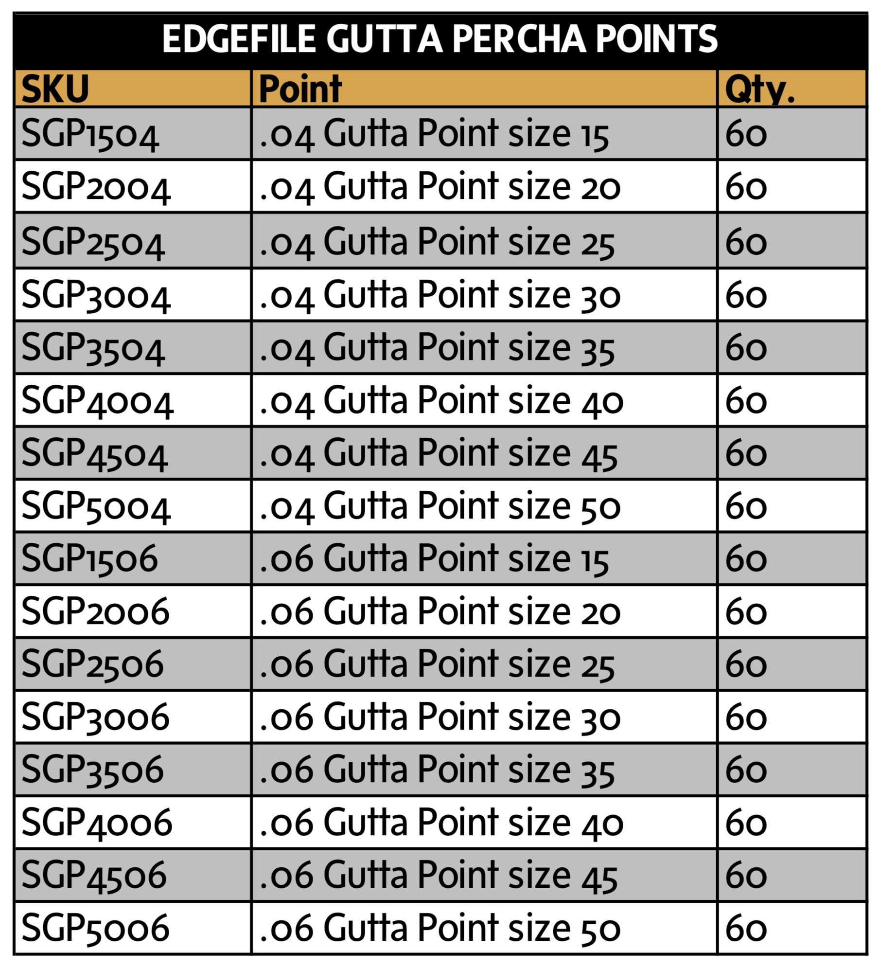 Our EdgeSequel™ points come in all the standard sizes, from 15 to 50 in .04 and .06 taper and are standard length 29mm +/-1.