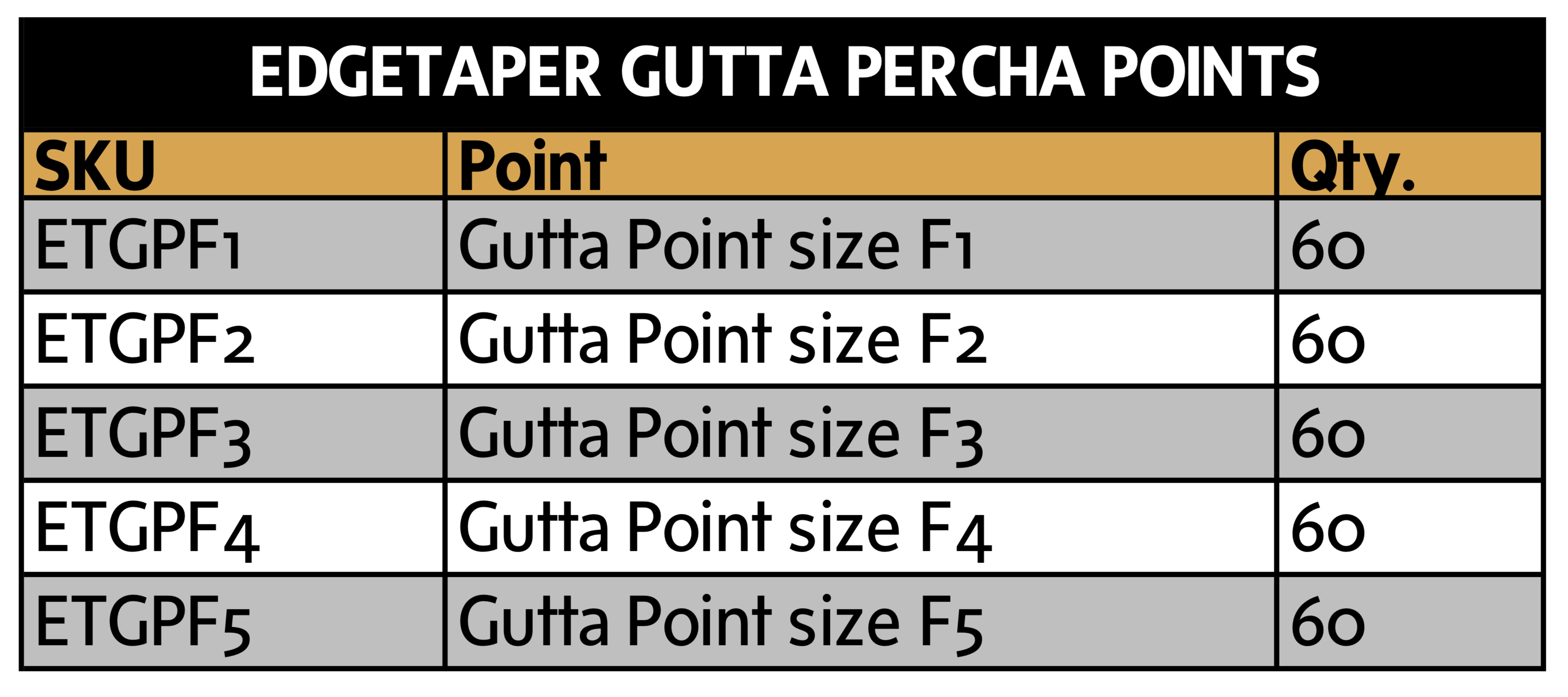 You can use Edge Gutta Points to fill cases shaped by any popular file (including: WaveOne®, ProTaper®, GT® or GT Series X®, Vortex®, ProFile®, Sequence®, K3®, or TF File®) — to provide great, beautiful fills. It will fill all tip sizes and tapers.